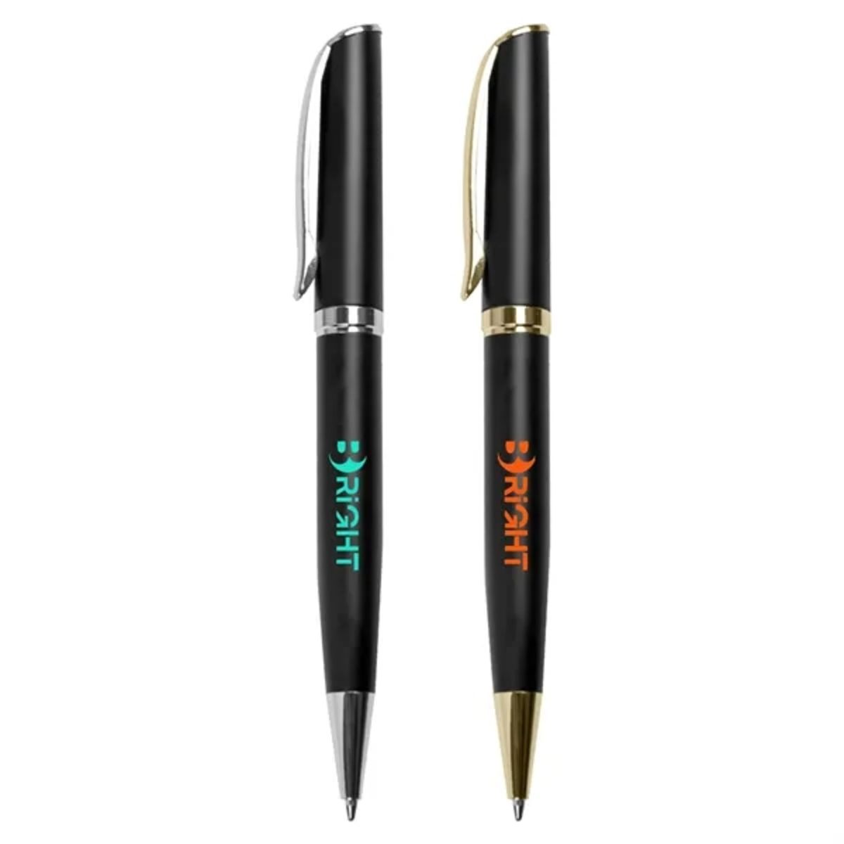 Introducing our timeless and elegant metal pen, crafted from heavy brass for a premium feel. The pen features a sleek matte black barrel with a silver chrome coating, creating a sophisticated look. The barrel can be engraved, resulting in a shiny mirror finish that adds a touch of personalization. The pen is further enhanced with gold and silver trim, adding a touch of luxury. Rush service and Unprinting service is acceptable. Price above 1000 pieces is via Ocean freight.