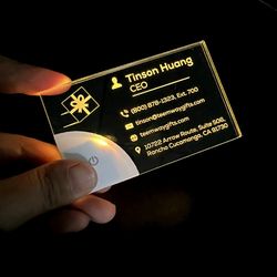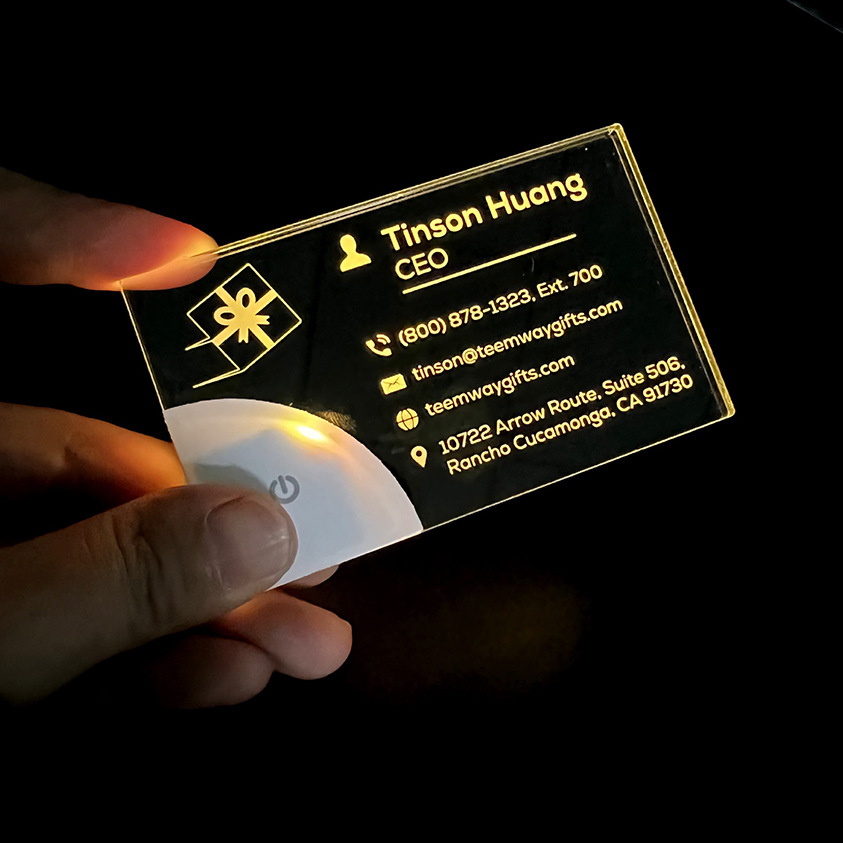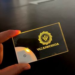 This glowing LED business card is made of transparent acrylic material. The size is 3.54x2.09''. It can emit seven colors of light, with seven different colors of light and three adjustable dimming modes, full of creativity and catching others' attention. It comes with a button battery. It can laser engrave content to make text flicker, which is very suitable for bars, KTV, Dance parties, concerts, advertising promotions, event promotions, customized business gifts, etc